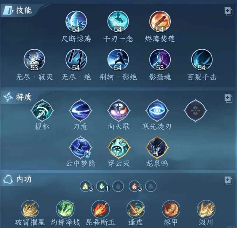 内功:不想自己研究的照抄吧,字幅也不够了讲内功的花需要讲太多,也并不是新人能够学习会的(比较简单的方法就是点开内功的评分看内功的进攻评分)