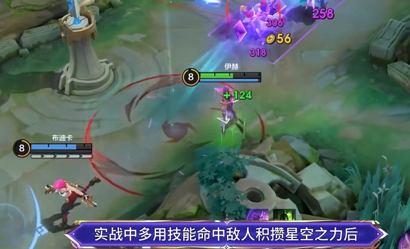 伊赫向指定地点引爆星空能量造成魔法伤害,命中英雄还将提升自身移动速度。