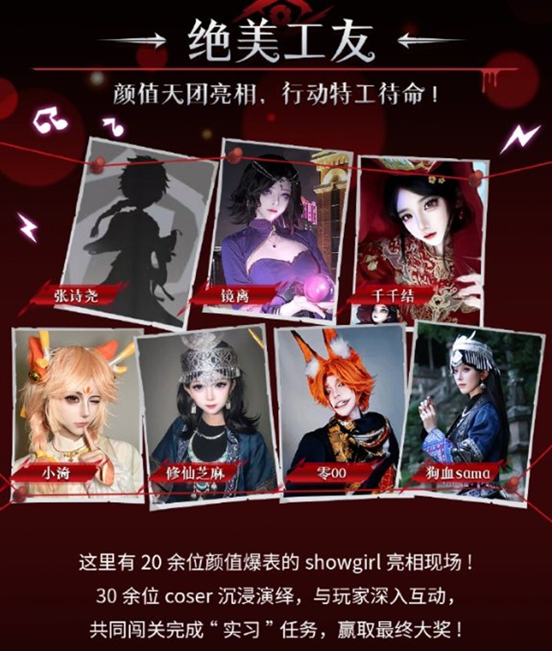 颜值天团亮相,行动特工待命!现场将有20余位颜值爆表的showgirl和30余位coser沉浸演绎,与玩家深入互动,共同闯关完成“实习”任务,赢取最终大奖。