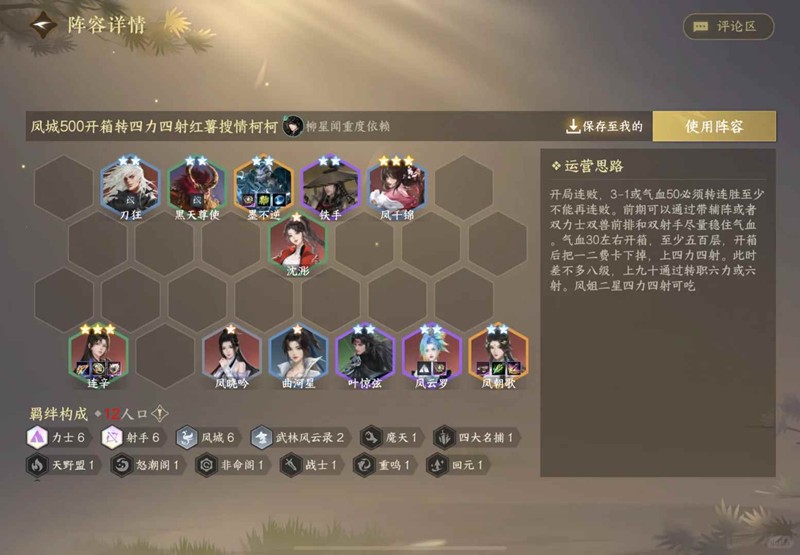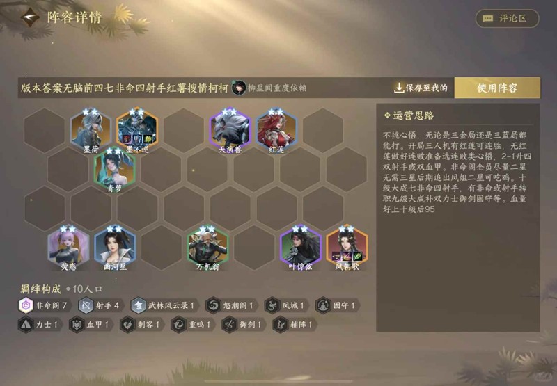 3.非命阁四射手(强度>四力四射)。四射完美弥补了非命阁缺后排主c的问题,七非命的大机甲也为四射提供前排,四力四射的升级版。但需要十人口,最好有个射手或非命转九人口成型。前中后期都很强能一路高歌连胜上十找三星五费,唯一疲软期是中后期d不出墨不逆和凤君凑不出七非命和四射手,找到了就能继续高歌猛进。