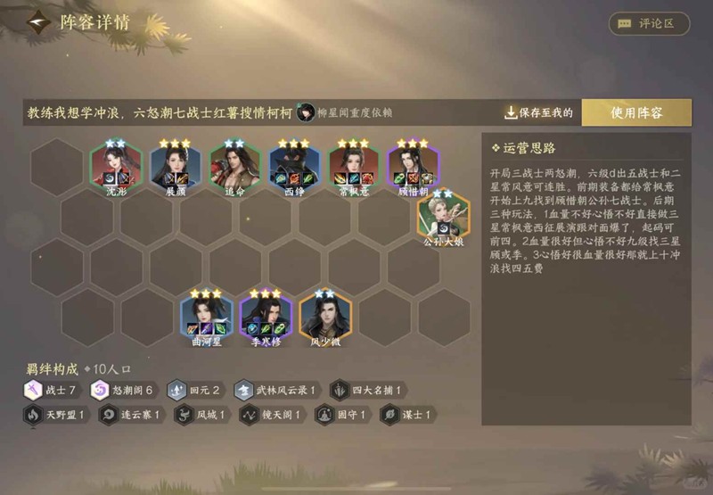 1.7战士+怒潮阁/天野盟。前期主c常枫意展颜或西铮,后期主c顾惜朝或直接d三星五费,看心悟棋子转职和血量的具体情况,决定是九级d三星四费顾惜朝季寒修等提棋子质量还是上十做三星五费
