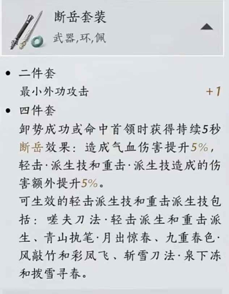 套装方面争议并不大,优先选择断岳玄甲套装,性价比极高优势:攻击首领时可以直接获得5%气血伤害buff(命中即可触发),并且可以额外提升派生技能伤害,契合裂石钧输出循环