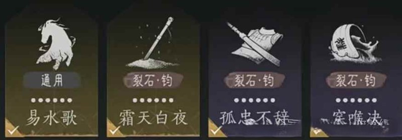 唐横刀:必带霜天白夜,可带易水歌,穿喉决,霜天白夜可以解锁拨雪寻春反击技,叠满6重忘机buff,取消蓄力前摇,提升易水歌整体伤害