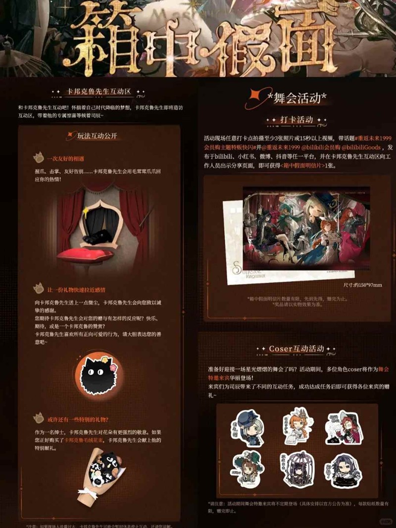 找任意打卡点拍照/拍视频(推荐晚宴区复古布景,氛围感超浓好出片),社交平台发布内容并 @官方账号,可领限量《箱中假面》明信片!数量有限,先到先得!