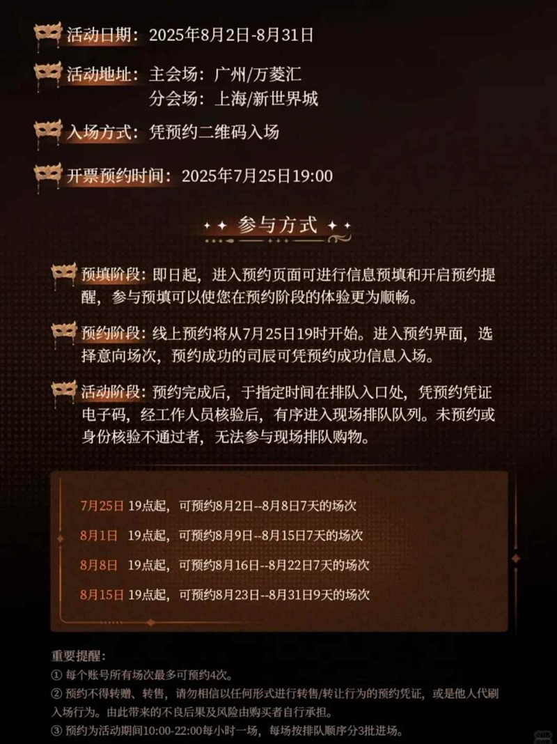 7月25日、8月1日、8月8日、8月15日每晚19:00起开放预约场次,活动期间每天10:00-22:00每小时一场,每个账号所有场次最多可约4场