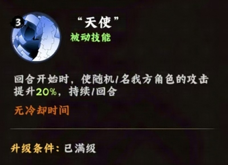 天使是被动技能,在每回合开始时随机提升1名我方角色20%攻击力持续1回合。这个技能让队伍的输出更具灵活性,建议搭配高攻击力的核心角色来最大化收益。在势均力敌的战斗中,这个随机增益往往能成为打破僵局的关键。