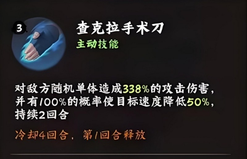 药师兜在火影忍者木叶高手中定位为辅助型角色,虽然初始品质仅为S级,但培养成本低且容易上手。他的主动技能查克拉手术刀能对随机敌人造成338%攻击力的伤害,并附带100%概率使目标速度降低50%的效果,持续两回合。这个技能冷却时间为四回合,在战斗开局就能使用,减速效果能有效打乱敌方节奏。