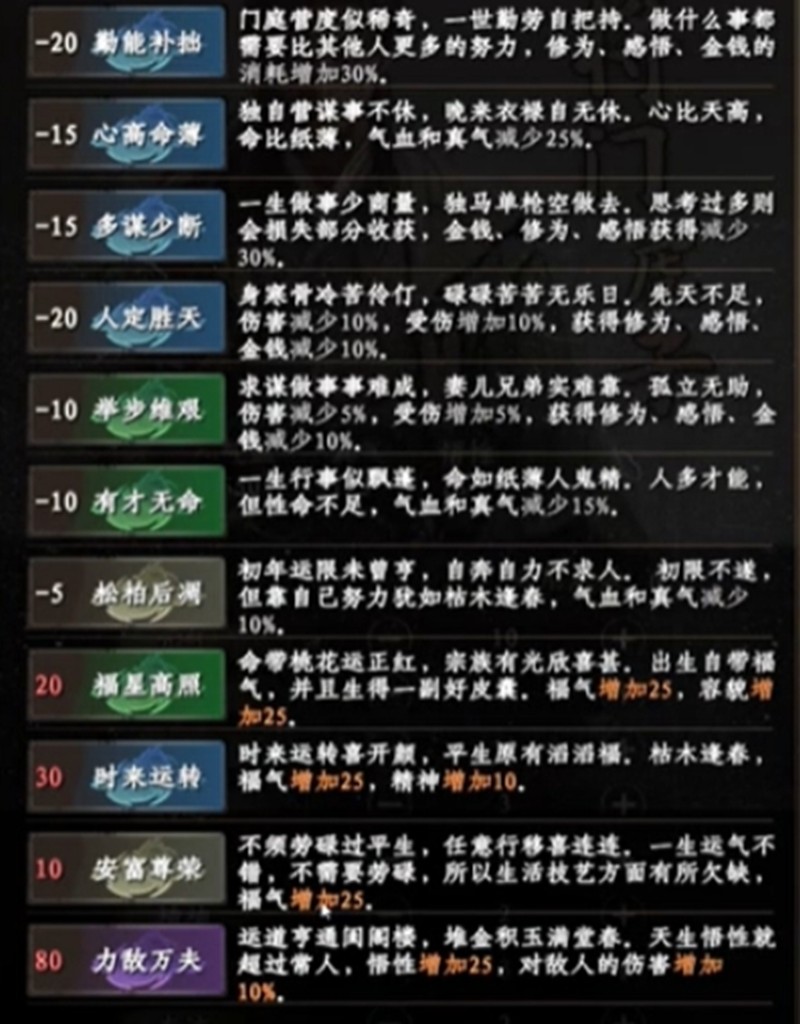 力敌万夫天赋适合喜欢战斗的玩家,可以提升15%的伤害输出。修身齐家天赋则适合偏好生活玩法的玩家,能增加5点生活技能属性值并使效果翻倍。提升福气和容貌的天赋也有助于触发隐藏剧情和结交特殊NPC。其他天赋如增强悟性、磨砺精神等都可以根据个人喜好自由搭配。
