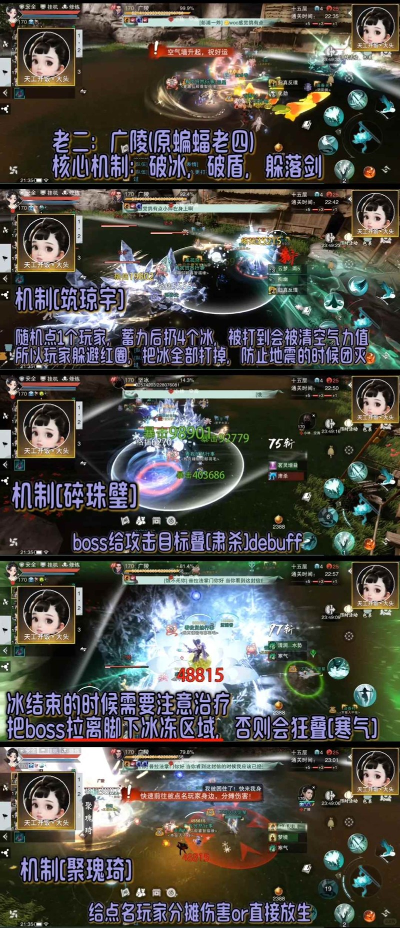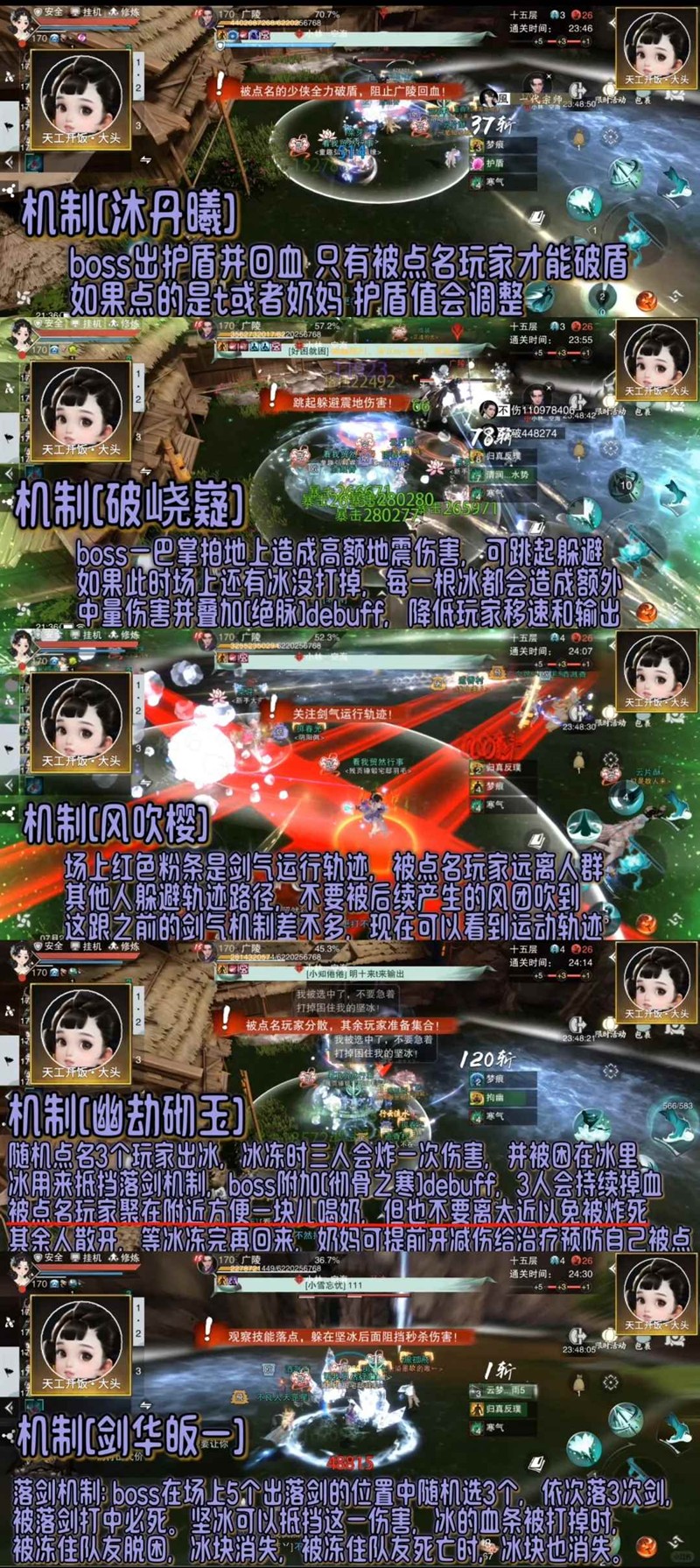 [剑华皈一]:boss在场上5个出落剑的位置中随机选3个,依次落3次剑,被落剑打中必死。坚冰可以抵挡这一伤害,冰的血条被打掉时,被冻住队友脱困,冰块消失,被冻住队友死亡时,冰块也消失。除了被冻住玩家,所有人集合躲在冰后抵挡伤害,根据落剑的位置移动躲避,并视情况逐渐破冰,以便落剑结束时,及时快速救出队友。躲落剑时奶妈注意治疗被冻住队友,以免冰块消失无法抵挡落剑伤害。如果奶妈全被冻住了,可考虑先救一个出来奶几口