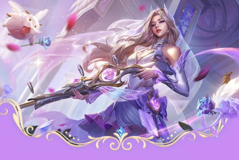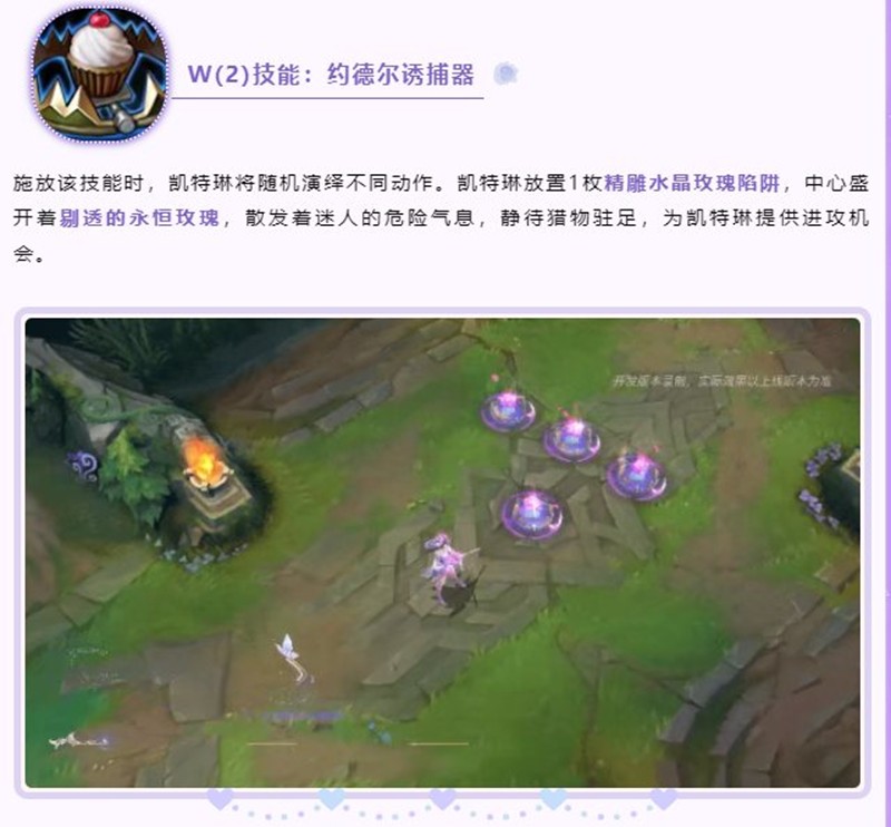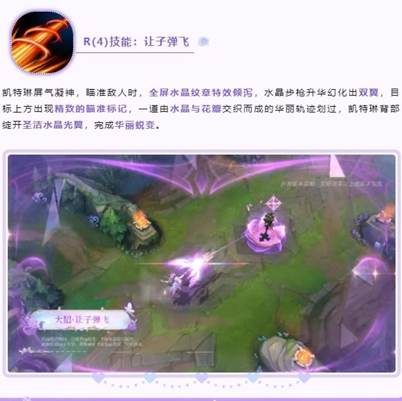 “水晶玫瑰凯特琳”身着浅紫色礼服,裙边装点着璀璨的水晶玫瑰,搭配高跟鞋,优雅而迷人。她的技能特效也充满了浪漫与梦幻: