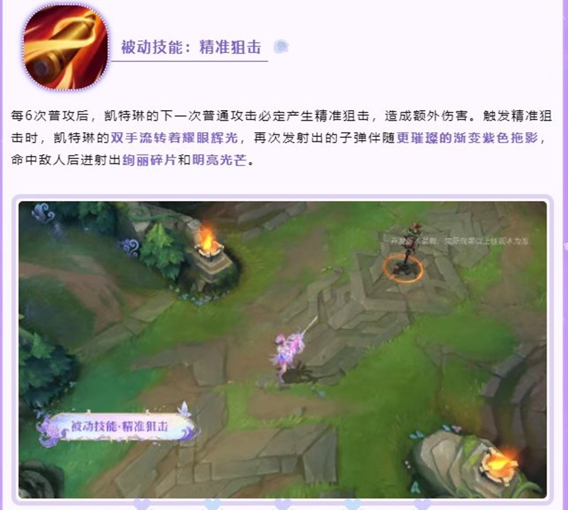 每6次普攻后,凯特琳的下一次普通攻击将产生精准狙击,造成额外伤害,子弹拖尾为渐变紫色。