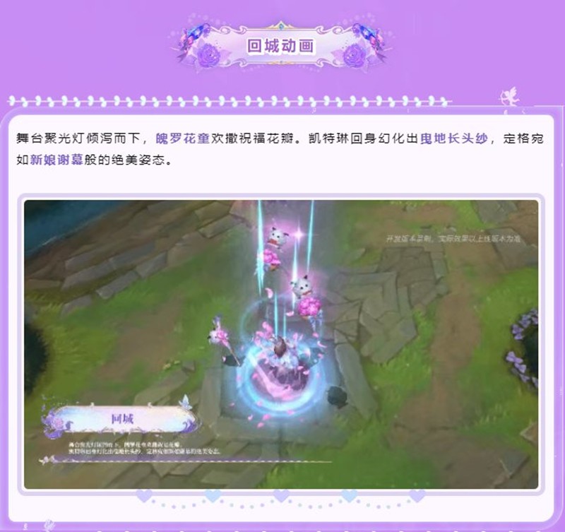 回城时,舞台聚光灯倾泻而下,魄罗花童撒出祝福花瓣,凯特琳回身幻化出曳地长头纱,宛如新娘谢幕。家园卫士状态下,她端坐于水晶枪管之上,由魄罗花童簇拥,轻盈飞离泉水。