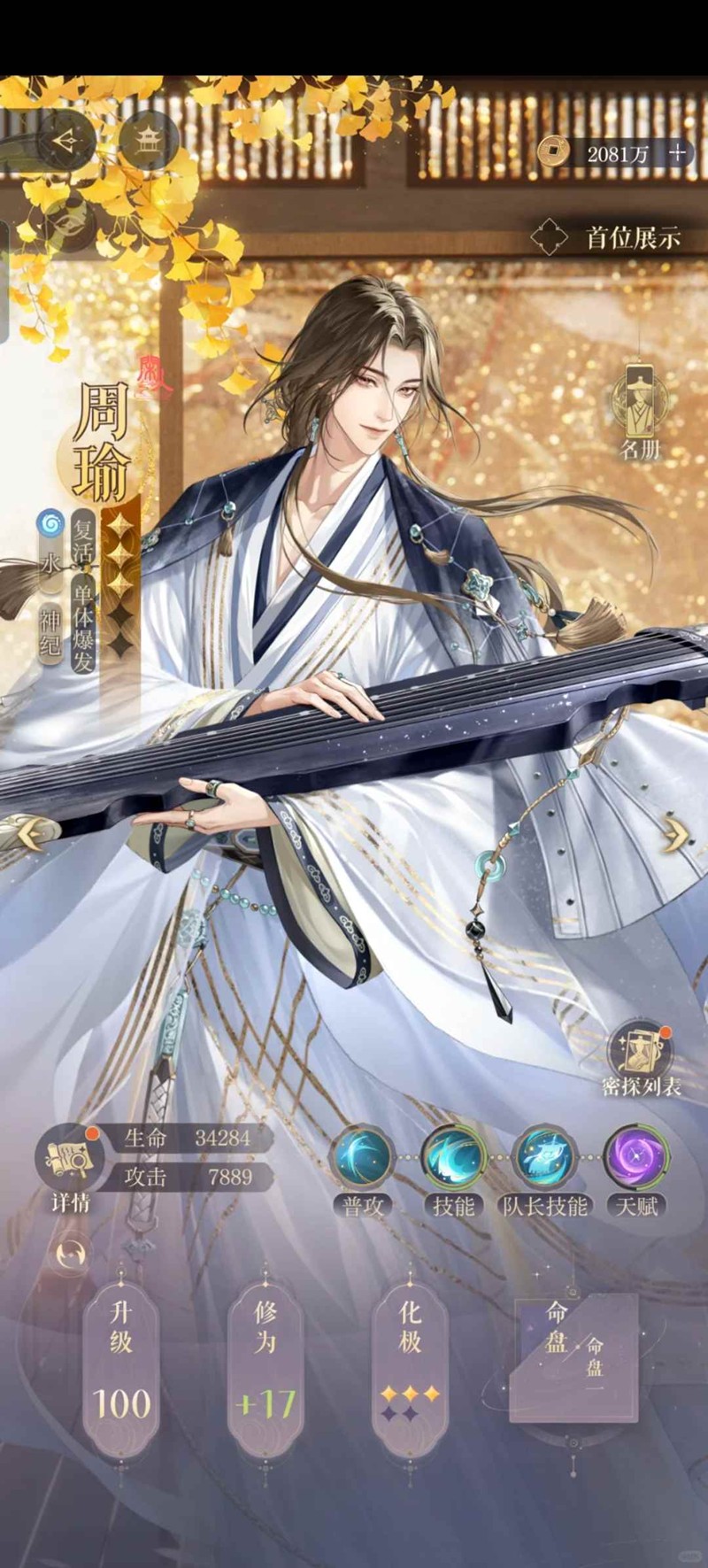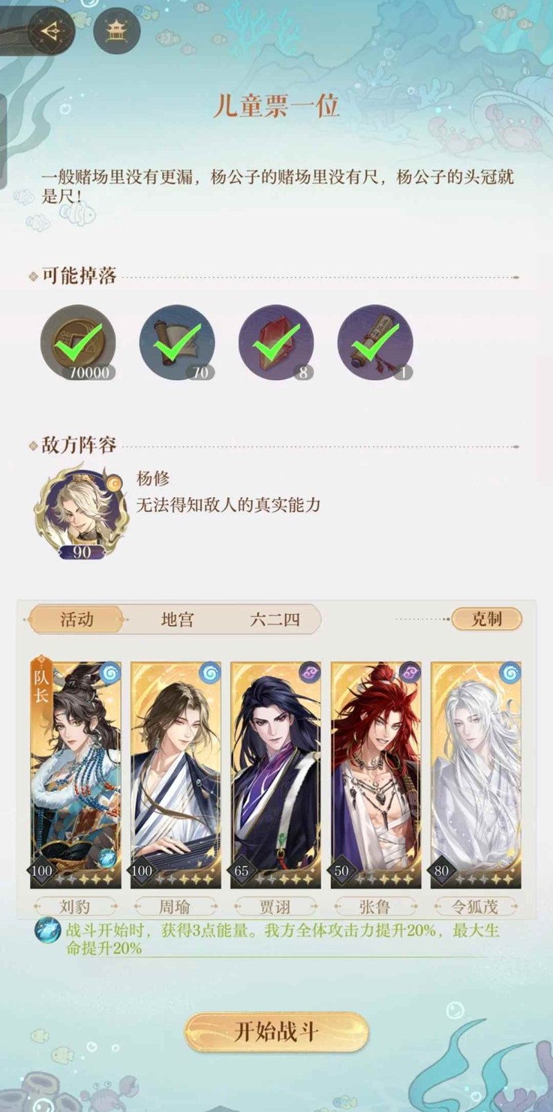 我的配队,张鲁伐身减去两条命。我周瑜血最厚,一二回合由他与杨修点数同。第三回合需要献祭一个密探,谁血最少与杨修点数同,最好是令狐茂/贾诩。