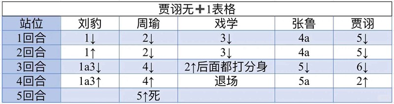 2.贾诩最好有+1或+2会非常简单,推荐大家洗一个吧!贾诩没+1对输出练度就还要多一点,得肉且攻击够,看表格,刘豹和周瑜一定要在放大招前活着。