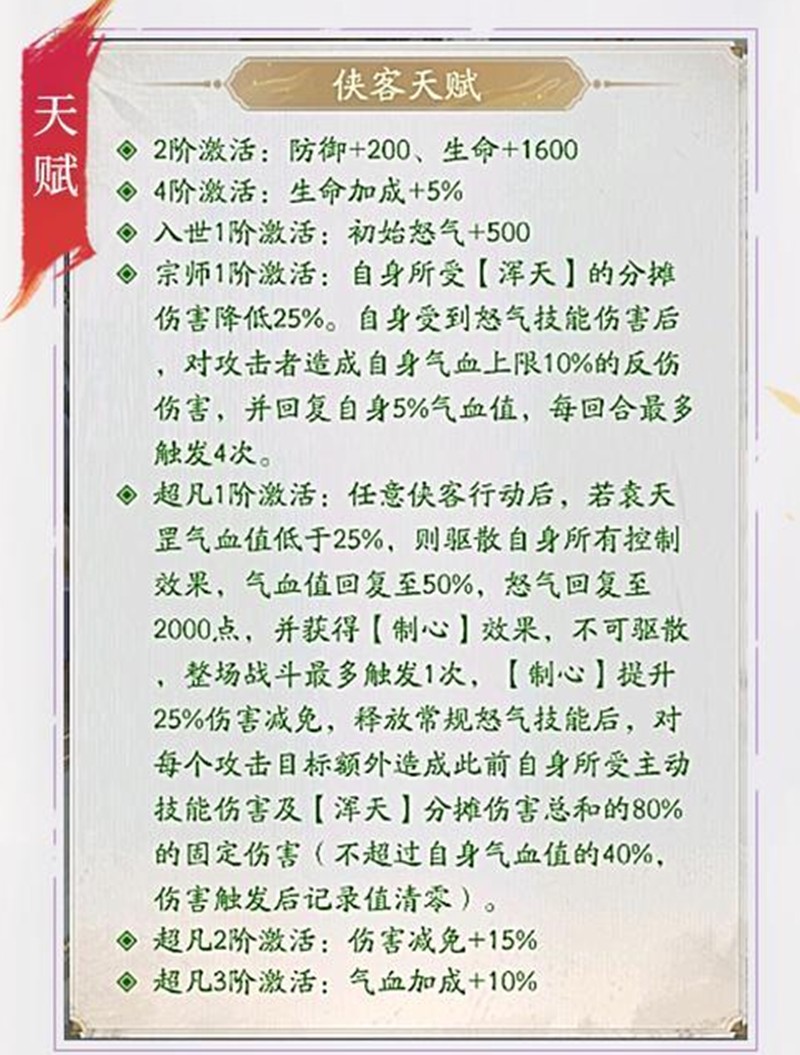 袁天罡的天赋技能进一步强化了他的防御能力。当血量低于25%时,他会自动恢复生命值和怒气,同时强化"浑天"效果。这使得他不仅能承担大量伤害,还能在危急时刻为队友提供支援。