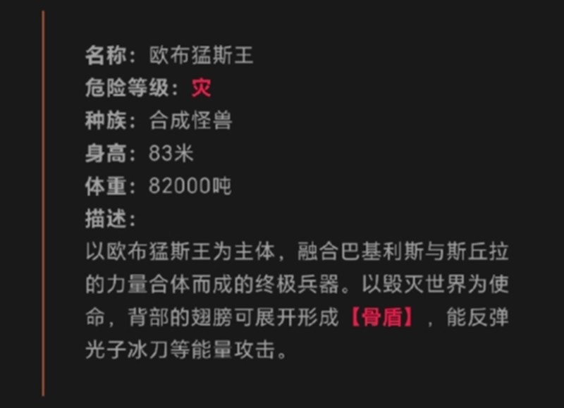 奥特曼超时空英雄中的欧布猛斯王是游戏前期就会遇到的强力BOSS,这个由三大怪兽融合而成的合体兽拥有83米的巨大体型和82000吨的惊人重量。作为奥特曼超时空英雄中极具威胁的反派角色,欧布猛斯王在战斗中展现出了多种强大的攻击手段。