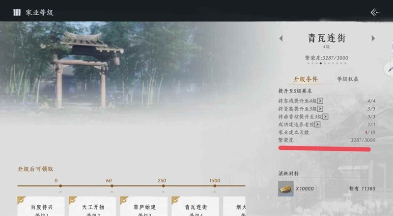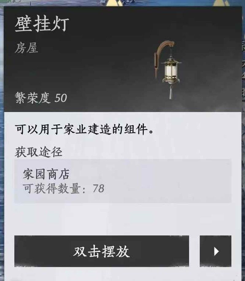2级升3级时有可能会被卡繁荣度!这时候就在 建造模式-家业建造-组件 里面放这个壁挂灯,这个灯是性价比极高的家具,100囤囤粟给50繁荣度。
