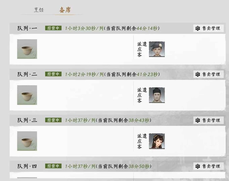 升到四级之后,有很多庄客技能升级材料,先给厨子和酿酒的升级,然后备席的。