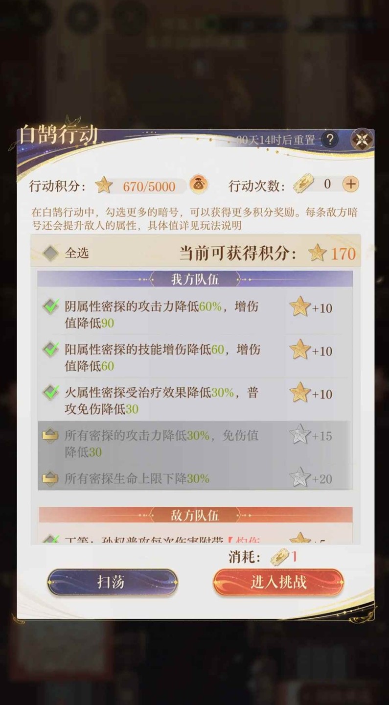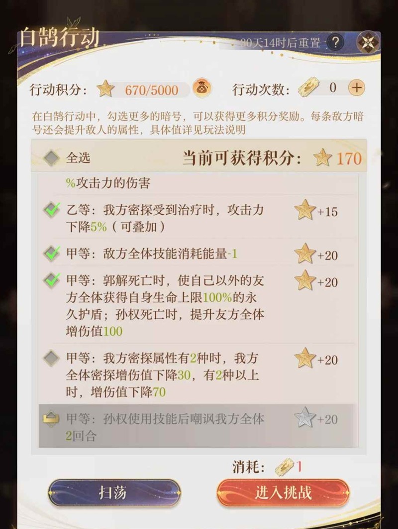 如鸢游戏以策略卡牌和沉浸式剧情为核心玩法,玩家只需完成指定任务和剧情对话就能快速通关。游戏中有白鹄行动玩法,玩家可以通过这一玩法获得大量密探培养材料,那么八月这一玩法应该怎么打到基础170星呢?小编为你准备了一份攻略,一起来看看吧~