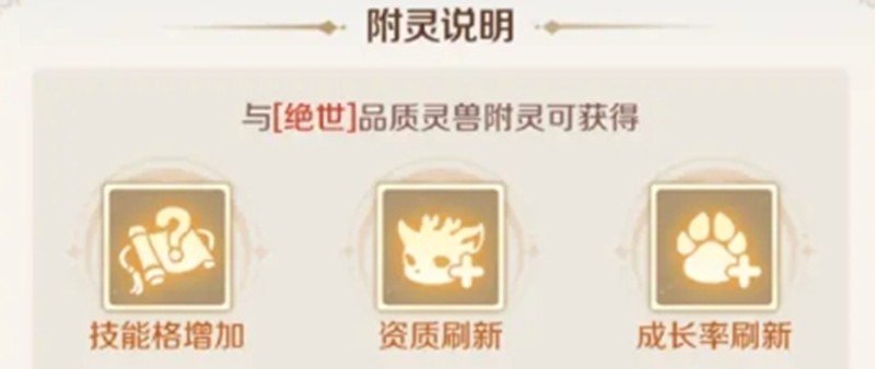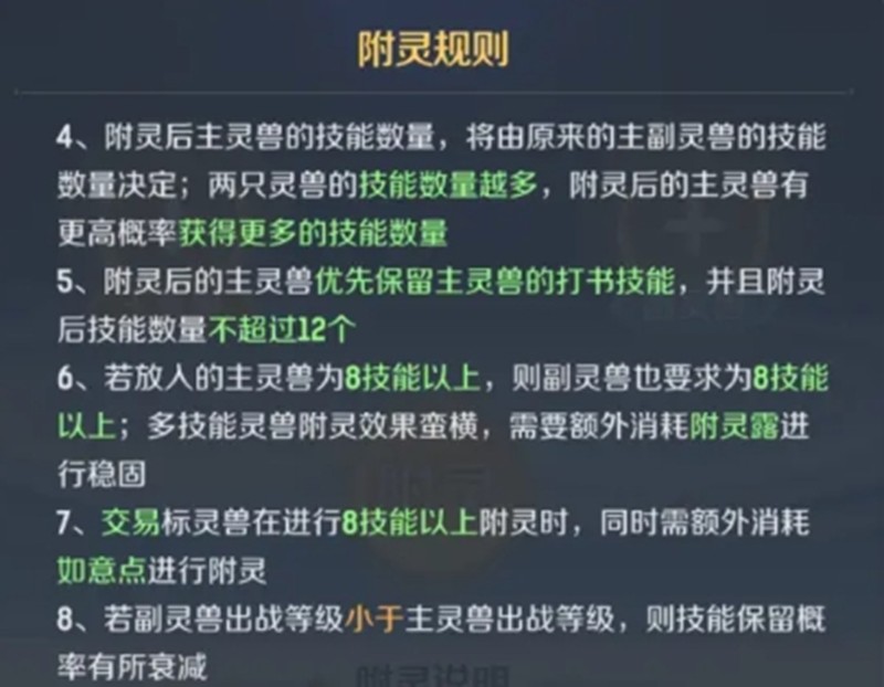 附灵合宠是融合系统中的重要环节。每次附灵都可能增减技能格子数量,同时刷新宠物的资质和成长数据。主灵兽最终获得的技能数量与主副灵兽原有技能数量相关,最多不超过12个。进行8技能以上的高级附灵时,需要消耗额外的附灵露和如意点。