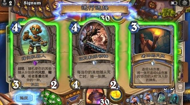 每回合你会随机获得三张牌,选择一张加入手牌。本期不能组牌,直接选择一个职业开始,你的套牌里都是223白板海盗,所以你的起手是三张海盗。