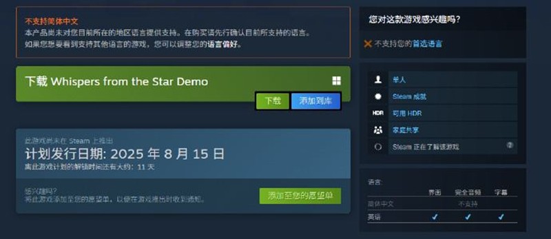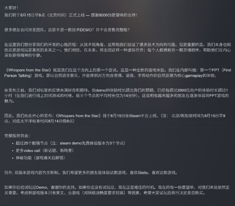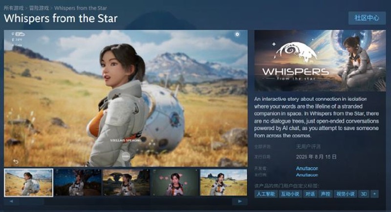 由米哈游创始人蔡浩宇亲自操刀的新作《Whispers from the Star》(以下暂译作《星之低语》)正式公布了发售日期。这款采用AI技术打造的游戏将于8月15日上午9点在Steam平台上线,售价定为9.99美元,折合人民币约72元。值得注意的是,该游戏目前锁国区且仅支持英语语言。