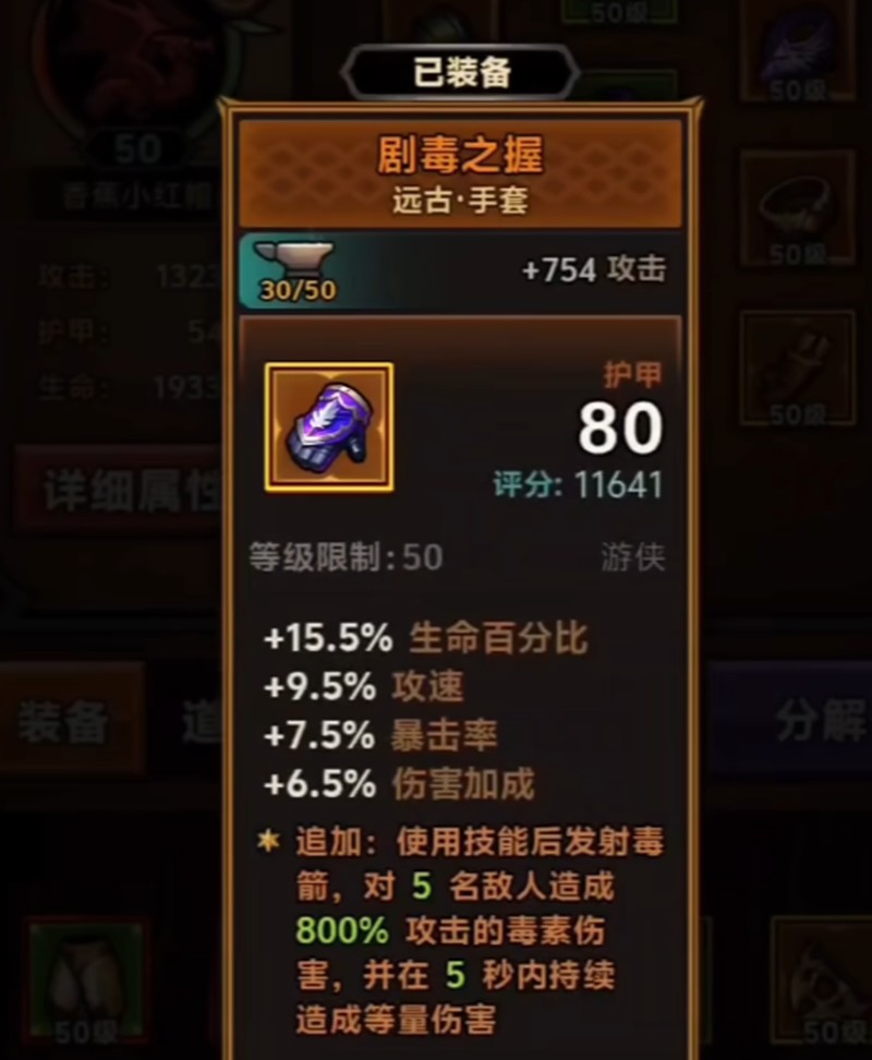剧毒之握作为远古手套,拥有754点基础攻击力,50级即可装备。这件装备不仅能提升15.5%生命值,还能增加9.5%攻速和7.5%暴击率。其特殊效果是在使用技能后发射毒箭,对五名敌人造成800%攻击力的毒素伤害,持续5秒。