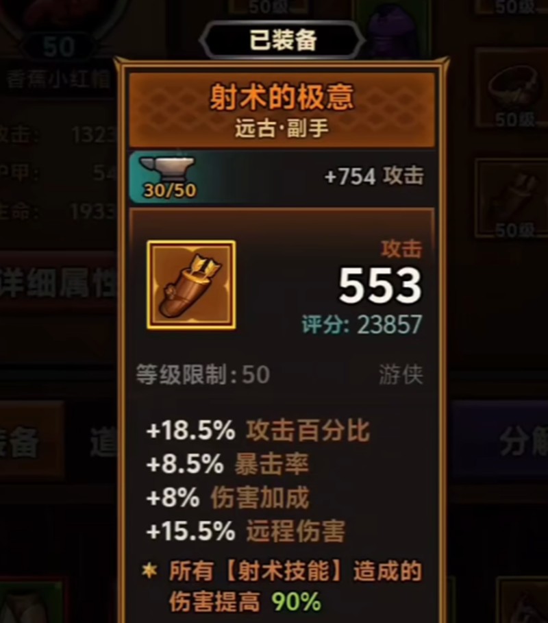 射术的极意能提升90%射击伤害,使用技能时增加18.5%攻击力和8.5%暴击率。这件装备对远程伤害有15.5%加成,并能强化所有射术技能90%的伤害效果。