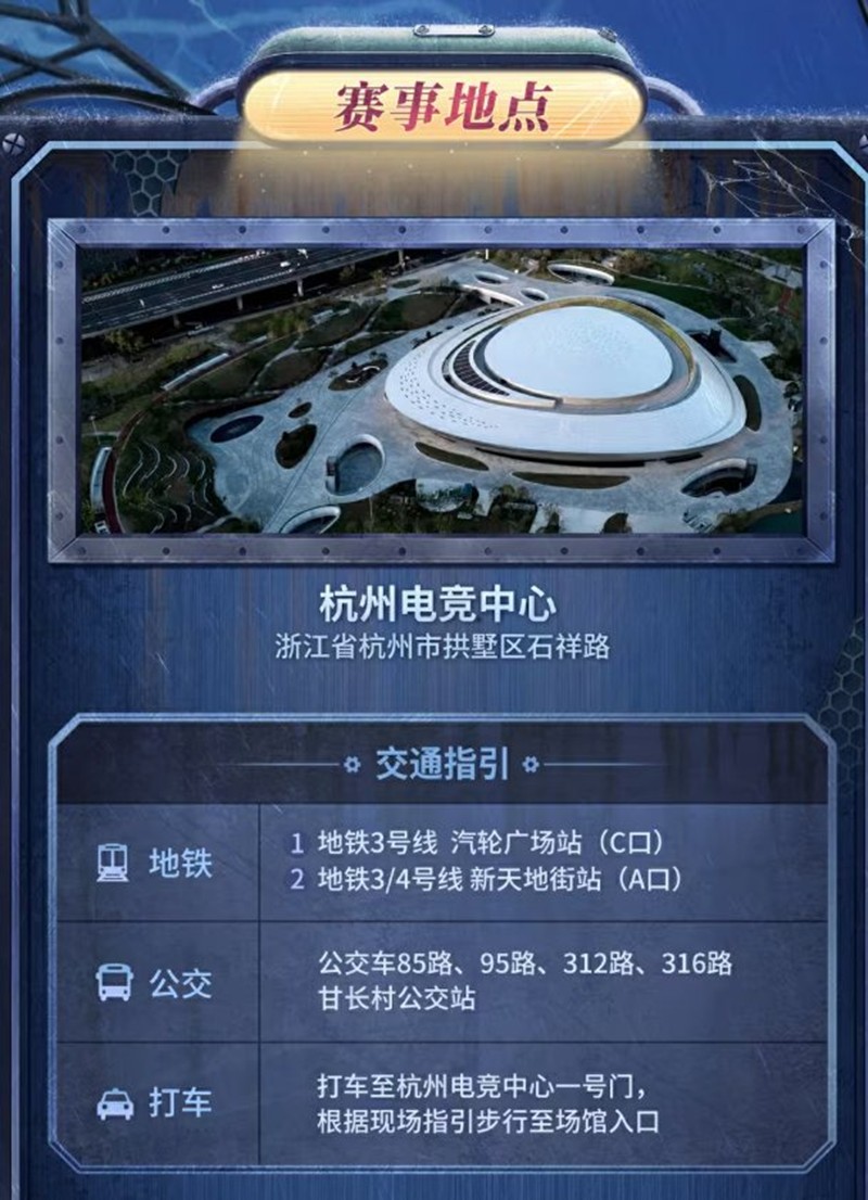 杭州电竞中心位于浙江省杭州市拱墅区石祥路。玩家可以通过地铁、公交或打车等方式到达场馆。地铁3号线汽轮广场站(C口)和3/4号线新天地街站(A口)是最近的地铁站点。公交车85路、95路、312路、316路甘长村公交站也可达场馆。