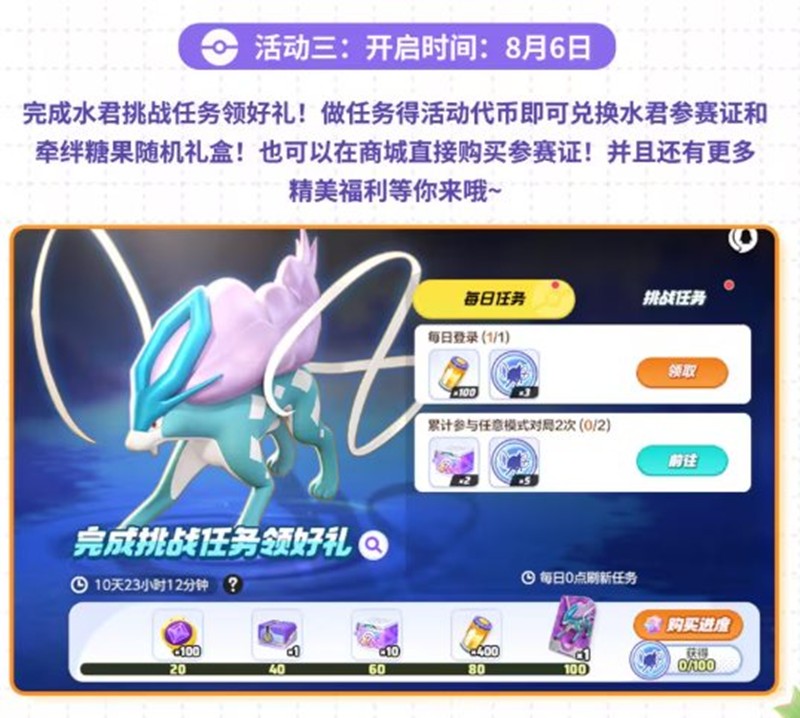 水君登岛活动:8月6日开启,玩家可以在练习场试玩水君,并完成相关挑战以获得水君租用参赛证和水君牵绊糖果。