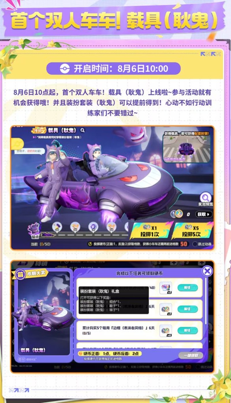 双人载具“耿鬼”:8月6日10:00上线,玩家参与活动即有机会获得,提前体验双人载具的乐趣。