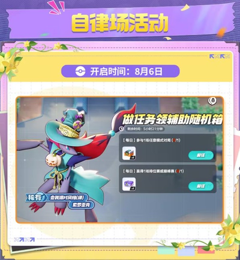 自律场活动:8月6日开始,完成任务可获得辅助随机箱,内含各种游戏道具。