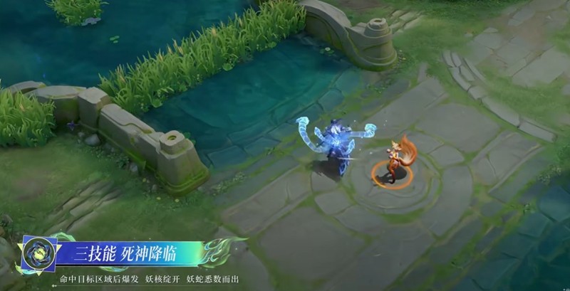 三技能:相柳遁入毒沼妖域,化身九首妖蛇汇聚妖核,千里索敌。命中目标区域后爆发妖核绽开,妖蛇悉数而出。