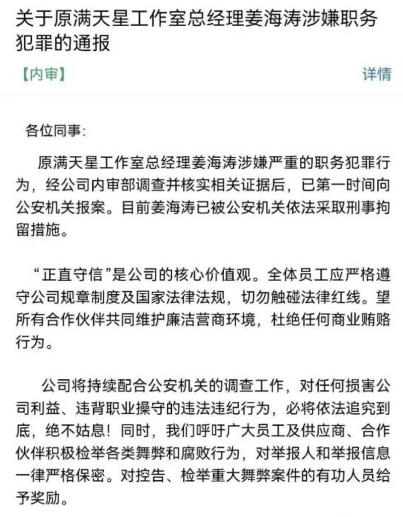 以下为关于原满天星工作室总经理姜海涛涉嫌职务犯罪的通报全文: