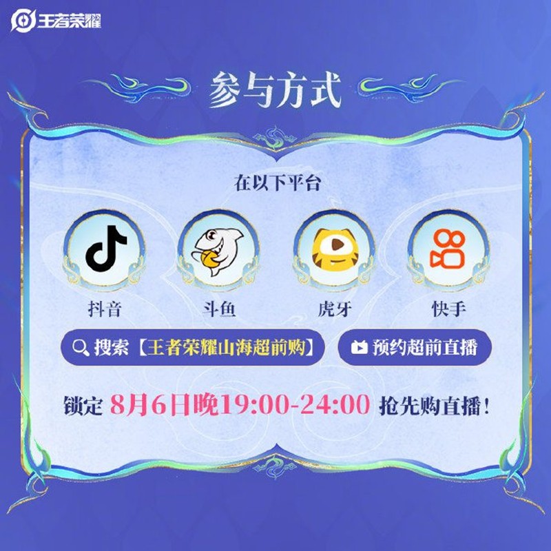 玩家们可以在抖音、斗鱼、虎牙和快手等平台搜索“王者荣耀山海超前购”或预约超前直播,锁定8月6日晚19:00-24:00的抢先购直播。在直播期间购买超前皮肤,还可以免费获得主播专属局内祝福语,穿戴皮肤开局可见,陪伴玩家上分顺利。