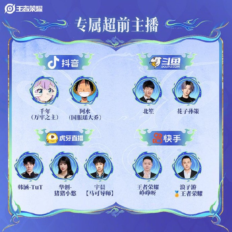 本次活动还邀请了多位知名主播参与,包括抖音的千年(万年之主)、阿水(国服瑶大乔)、北笙和花子孙策,斗鱼的拖米-TuT、华创-猪猪小悠和宇晨(马可导师),以及快手的王者荣耀峥峥呀和浪子游-王者荣耀。玩家们可以在这些主播的直播间中参与活动,享受更多惊喜福利。