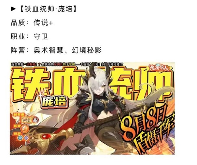 铁血统帅·庞培活动时间:8月8日05:00-8月22日04:59开启条件:服务器开启天数≥4天活动说明:通过限定召唤可获得【奥术智慧】与【幻境秘影】阵营的守卫幻灵——传说+品质幻灵铁血统帅·庞培。