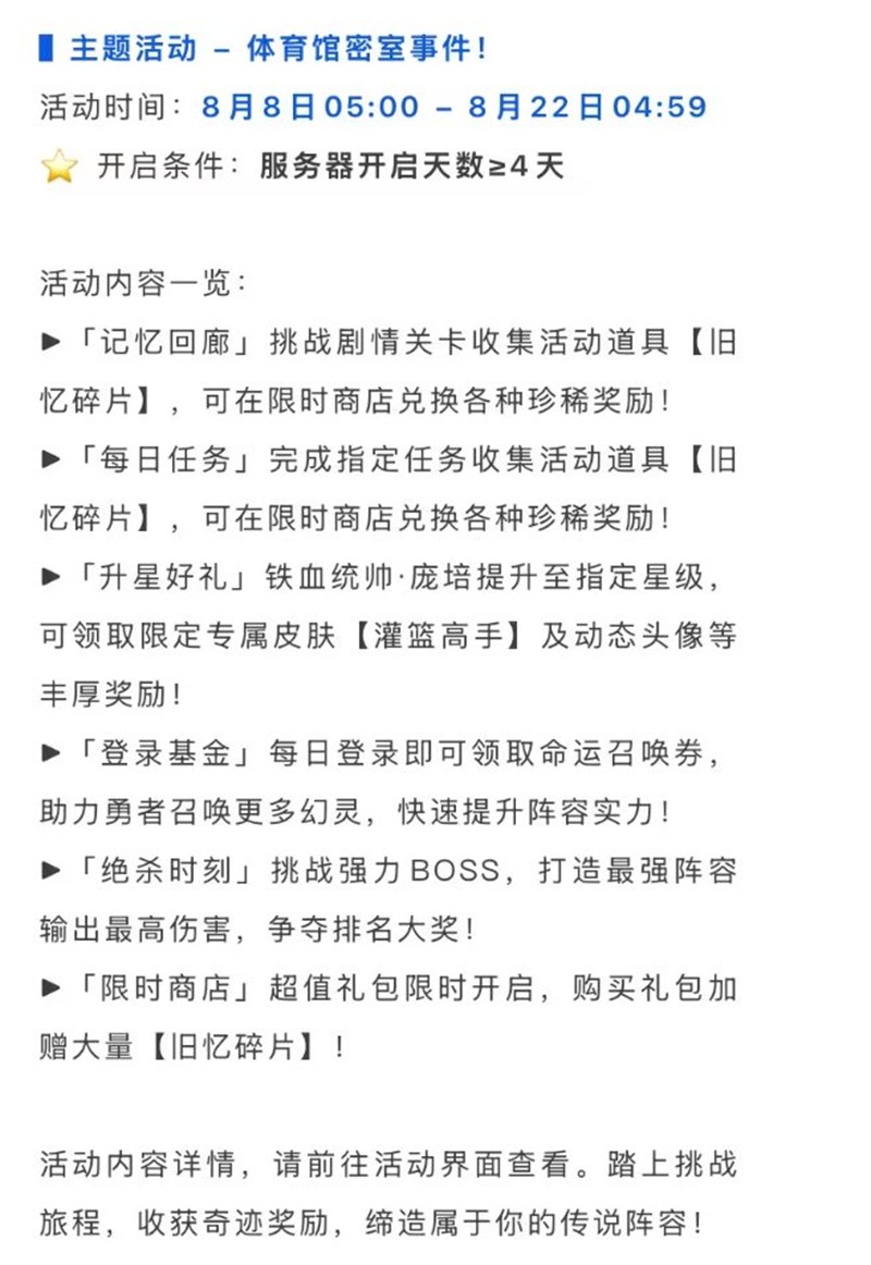 活动内容:挑战剧情关卡收集活动道具【旧忆碎片】,可在限时商店兑换各种珍稀奖励。完成指定任务收集活动道具【旧忆碎片】,可在限时商店兑换各种珍稀奖励。升星好礼:铁血统帅·庞培提升至指定星级,可领取限定专属皮肤【灌篮高手】及动态头像等丰厚奖励。登录基金:每日登录即可领取命运召唤券,助力勇者召唤更多幻灵,快速提升阵容实力。绝杀时刻:挑战强力BOSS,打造最强阵容输出最高伤害,争夺排名大奖。限时商店:超值礼包限时开启,购买礼包加赠大量【旧忆碎片】。