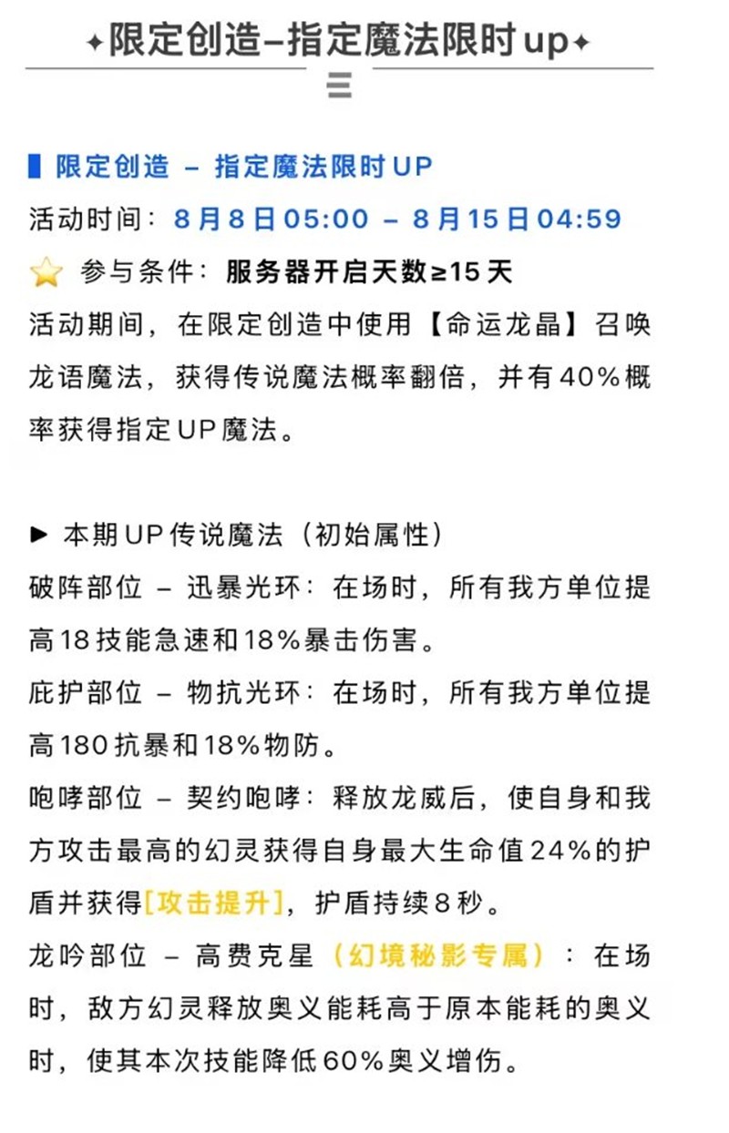 活动说明:在限定创造中使用【命运龙晶】召唤,龙语魔法,获得传说魔法概率翻倍,并有40%概率获得指定UP魔法。
