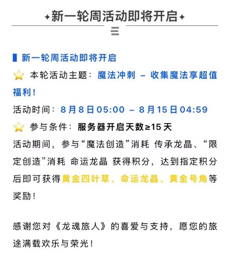 活动说明:参与“魔法创造”消耗传承龙晶、“限定创造”消耗命运龙晶获得积分,达到指定积分后即可获得黄金四叶草、命运龙晶、黄金号角等奖励。