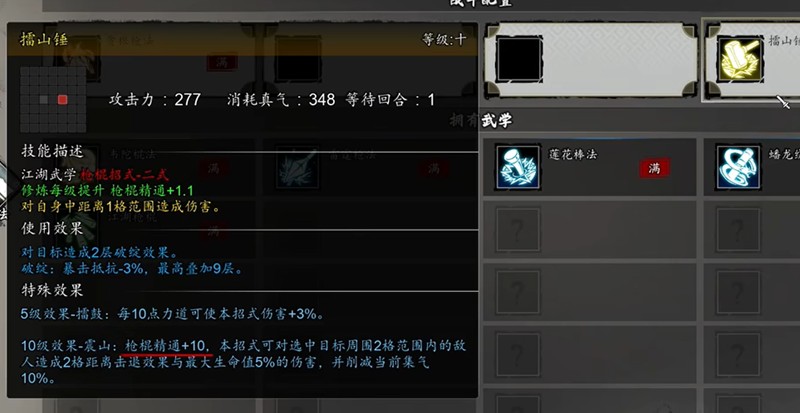 穿云一枪拥有319点的高攻击力,但真气消耗也高达545点。这套武学最大的特点是能对正前方5格范围内的敌人造成穿透伤害,并瞬间移动到敌人身后2格位置。适合追求高爆发的玩家使用。