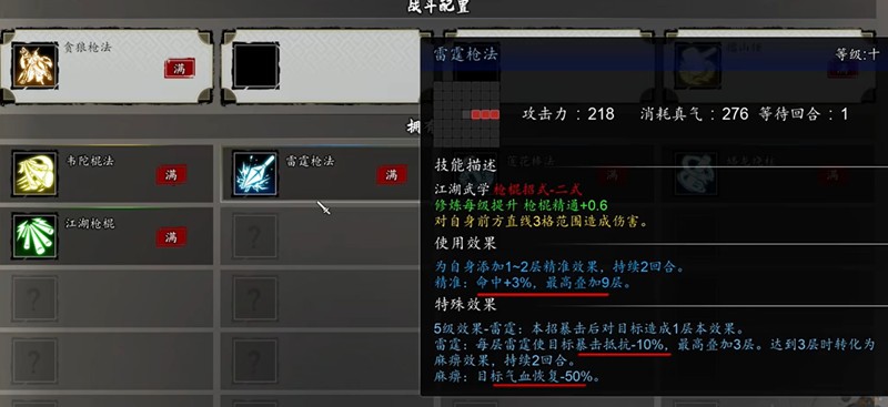 雷霆枪法的攻击力为218点,真气消耗276点。作为枪棍招式二式,它的威力比撼地锤更强。施展时可以对正前方直线三格范围内的敌人造成伤害,暴击时每层可降低敌人10%抵抗力,最高叠加三层后还能附加麻痹效果。被麻痹的敌人血量会降至50%,大大提升战斗优势。