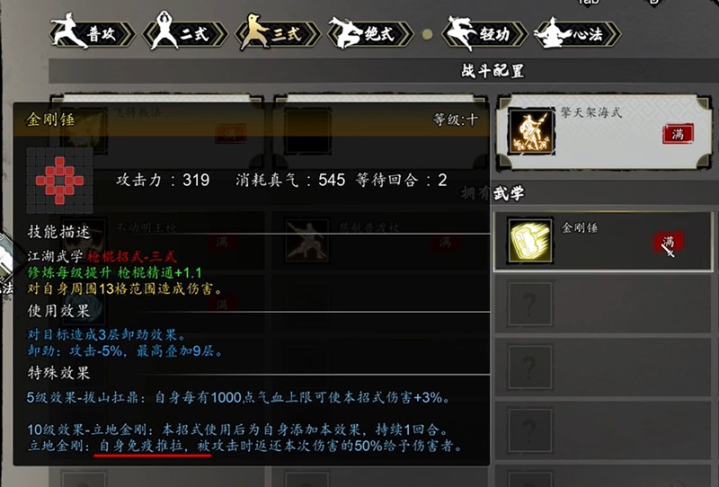 金刚锤同样具备319点攻击力,真气消耗545点。通过修炼提升后,枪棍精通可增加1.1点,攻击范围能达到惊人的13格。这套武学还能给目标附加三层卸劲效果,有效削弱敌人的攻击能力。