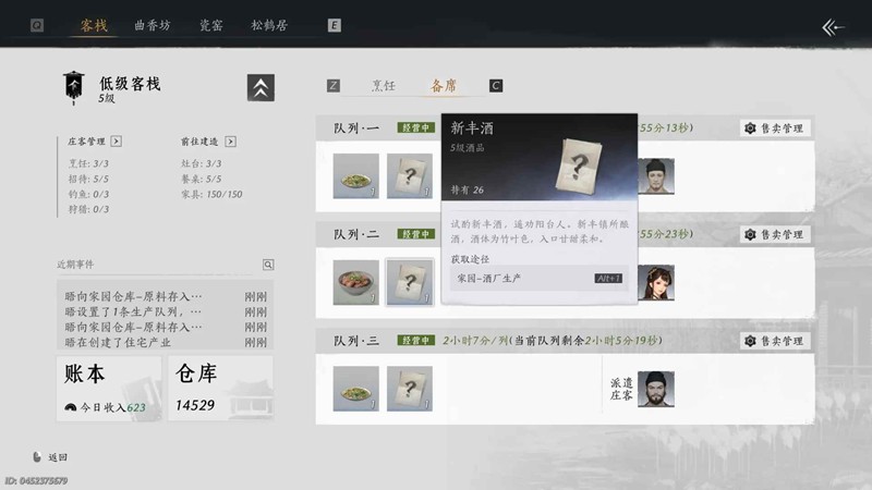 备席(关键点):新丰酒+新丰酒和鸨片炒菜+新丰酒和麋肉饭(这样差不多可以和新丰酒的产出对齐)