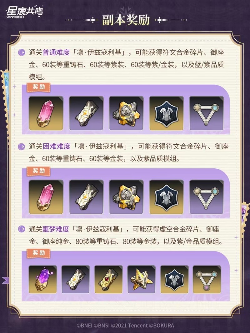通关普通难度“凛·伊兹寇利基”,可能获得符文合金碎片、御座金、60装等重铸石、60装等紫装、60装等紫/金装,以及蓝/紫品质模组。
