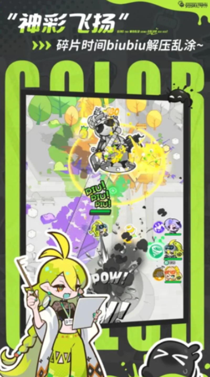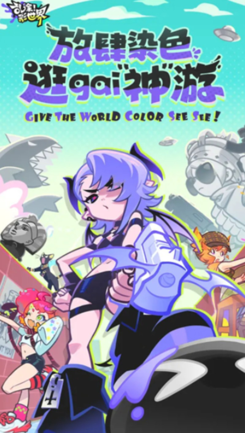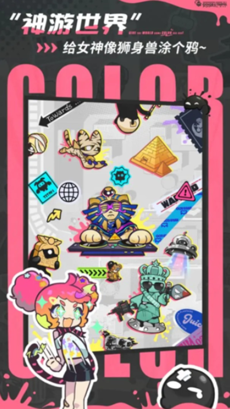游戏背景设定在一个黑白的世界里,玩家需要操控卡通角色进行喷涂对战。每位角色都拥有独特的颜色属性,通过射击方式将颜料喷洒在场景各处。随着游戏进程,原本单调的黑白世界会逐渐变成五彩斑斓的彩色世界。