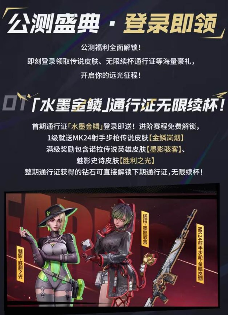 《远光84》公测期间,玩家登录游戏即可领取传说皮肤、无限续杯通行证等海量豪礼。首期通行证“水墨金鳞”登录即送,进阶赛程免费解锁,1级就送MK24射手步枪传说皮肤【金鳞岚烟】,满级奖励包含诺拉传说英雄皮肤【墨影骇客】、魅影史诗皮肤【胜利之光】。整期通行证获得的钻石可直接解锁下期通行证,无限续杯!