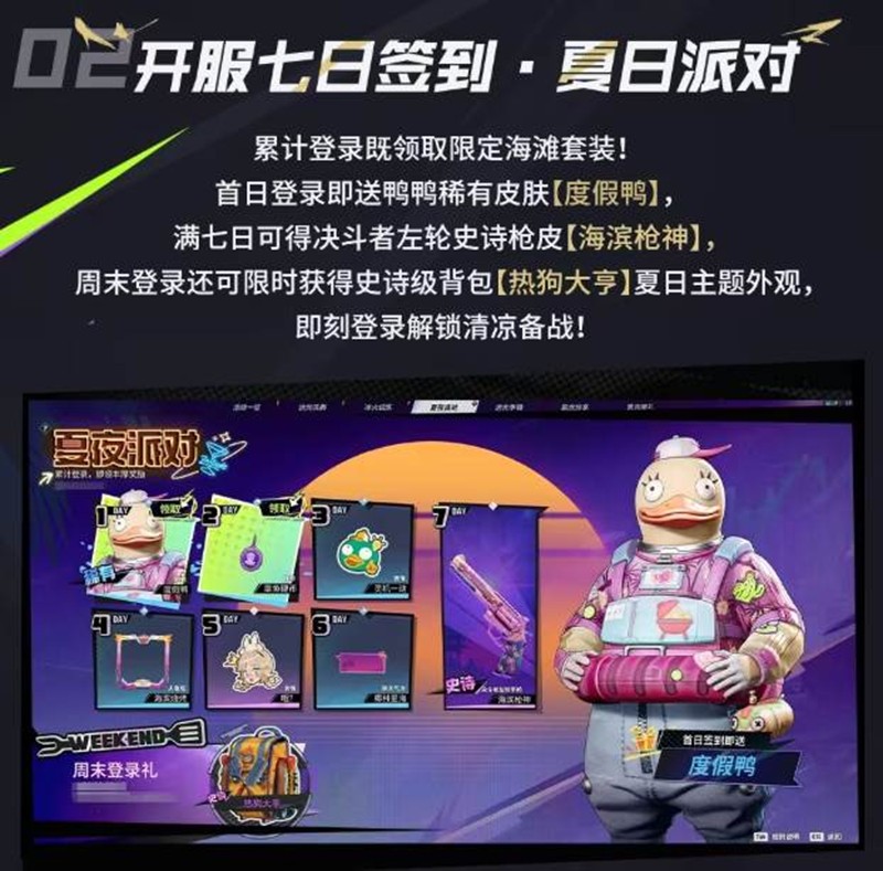 累计登录既领取限定海滩套装!首日登录即送鸭鸭稀有皮肤【度假鸭】,满七日可得决斗者左轮史诗枪皮【海滨枪神】,周末登录还可限时获得史诗级背包【热狗大亨】夏日主题外观,即刻登录解锁清凉备战!
