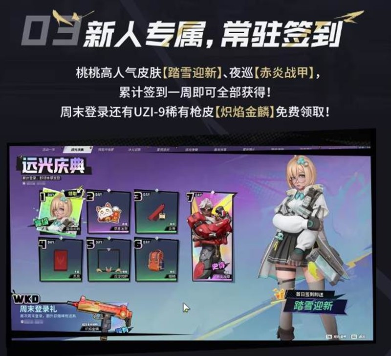 桃桃高人气皮肤【踏雪迎新】、夜巡【赤炎战甲】,累计签到一周即可全部获得!周末登录还有UZI-9稀有枪皮【炽焰金鳞】免费领取!