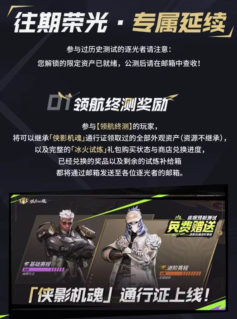 参与【领航终测】的玩家,将可以继承「领航机魂」通行证领取过的全部外观资产(资源不继承),以及完整的「冰火试炼」礼包购买状态与商店兑换进度,已经兑换的奖品以及剩余的试炼补给箱,都将通过邮箱发送至各位逐光者的邮箱。